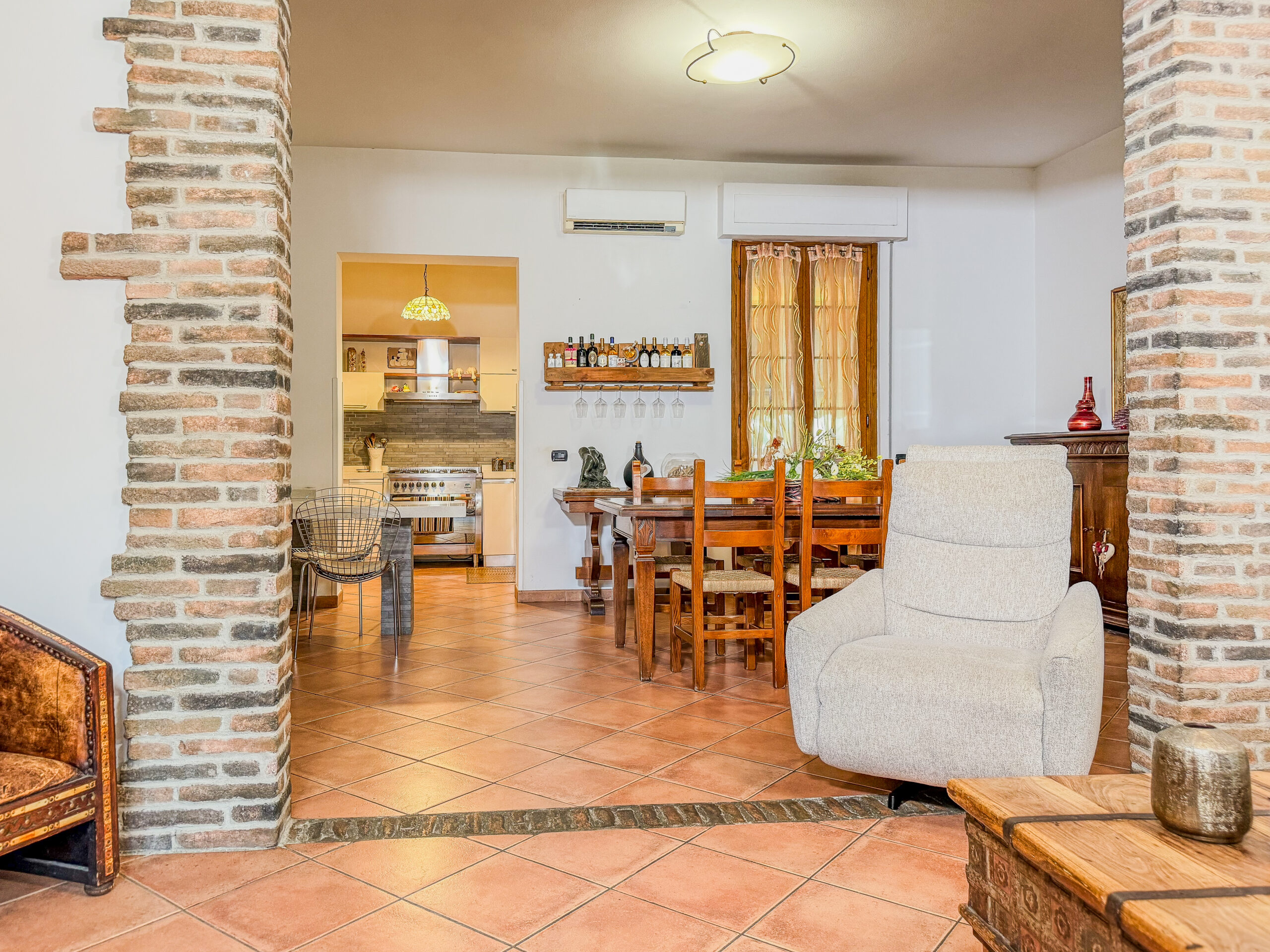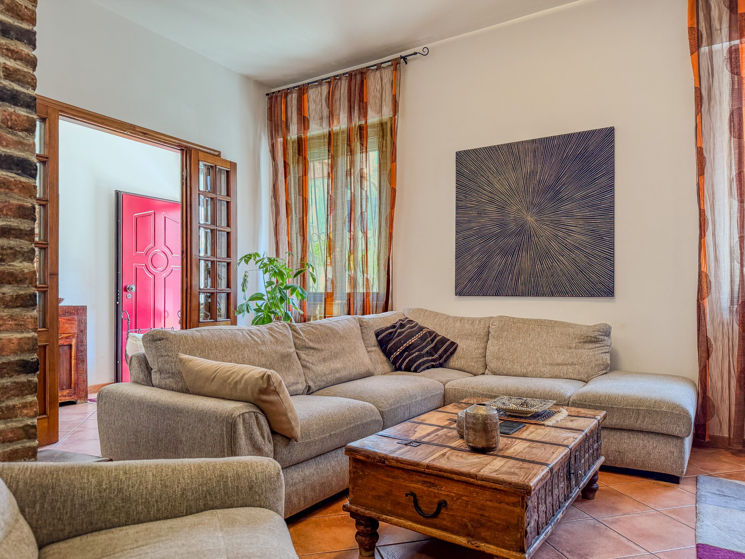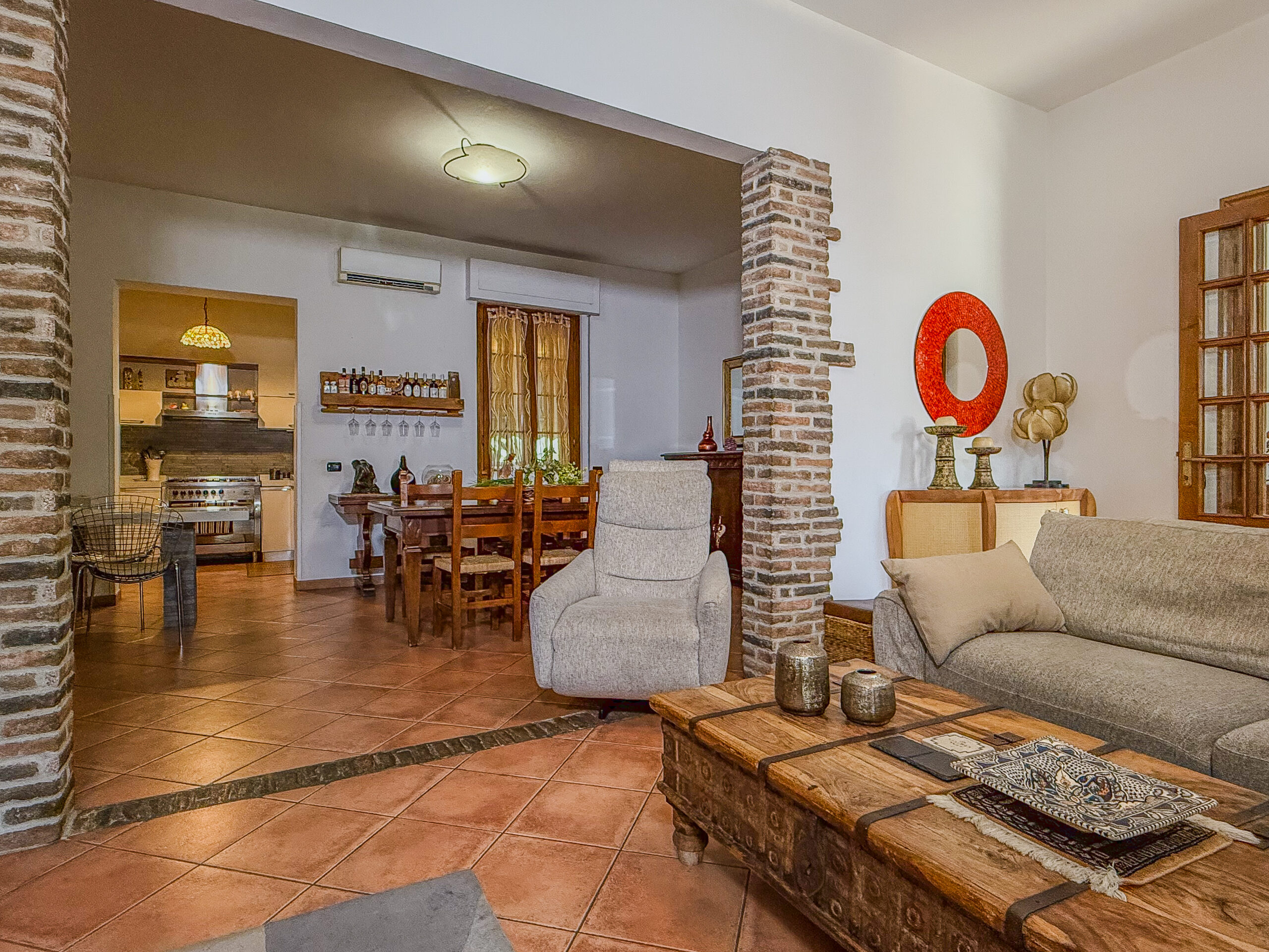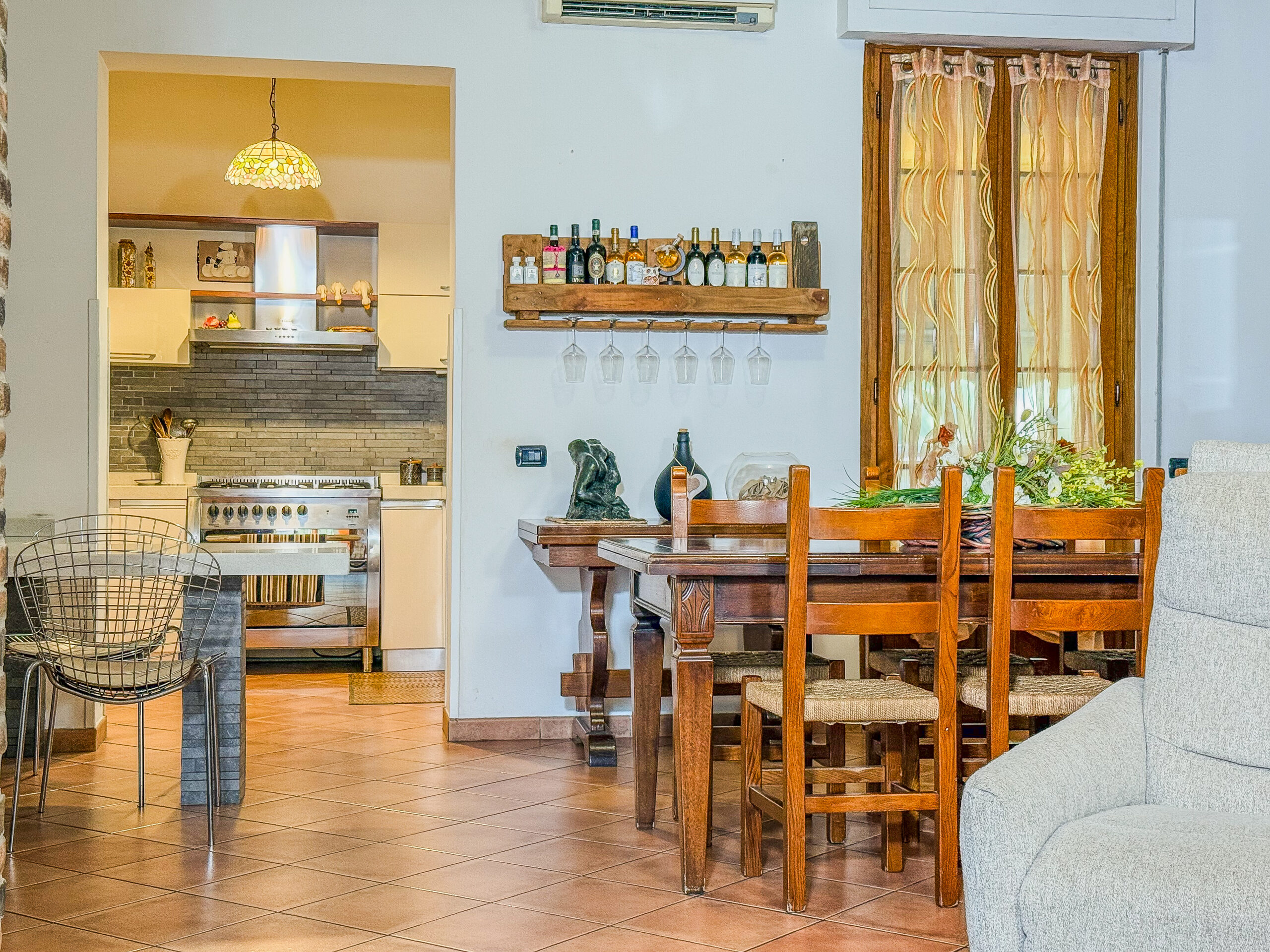 Al piano terra, la zona giorno si apre con naturalezza: salone immenso, cucina aperta sul tinello, giardino davanti, resede sul retro.