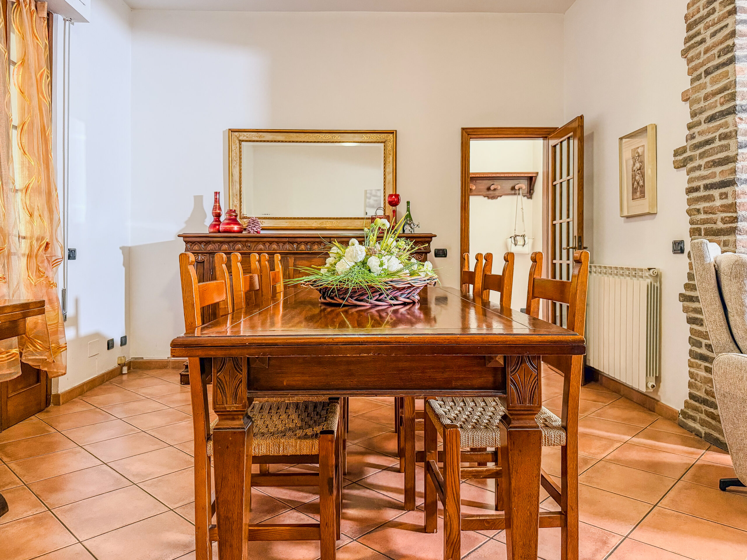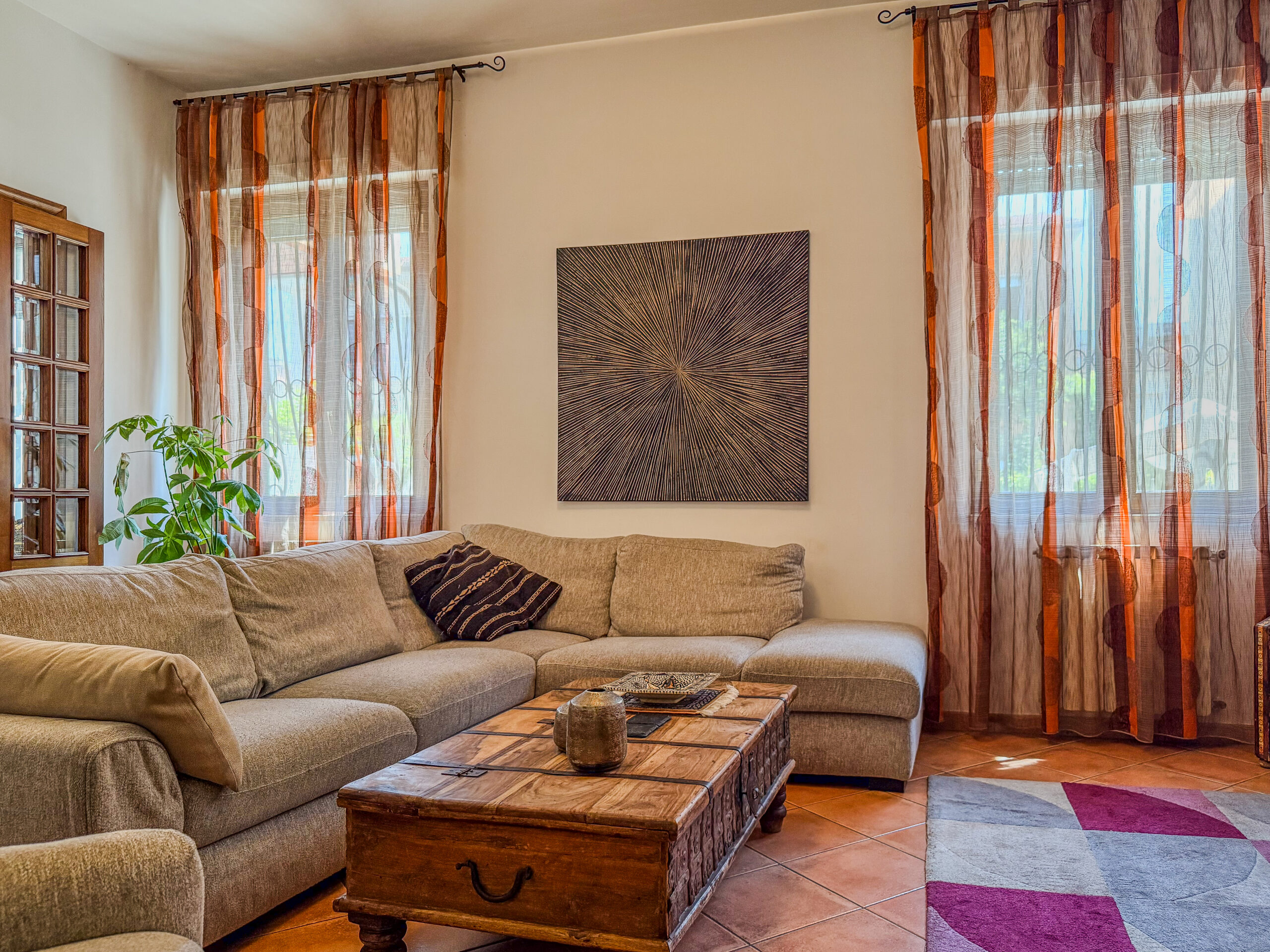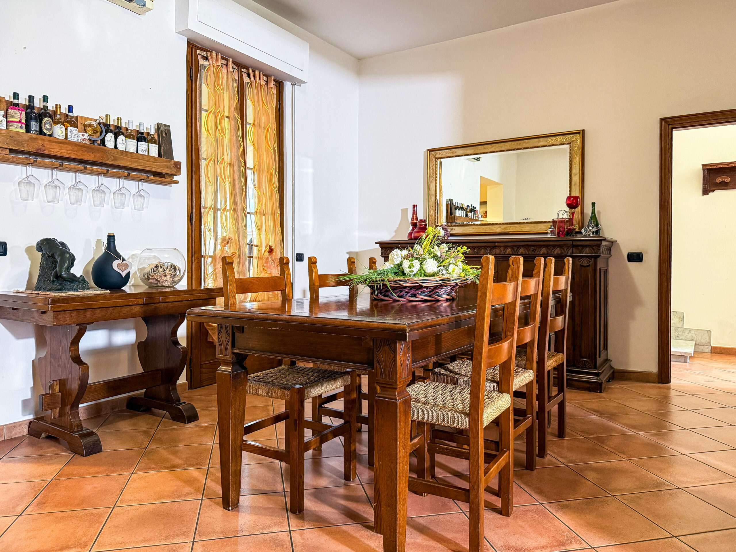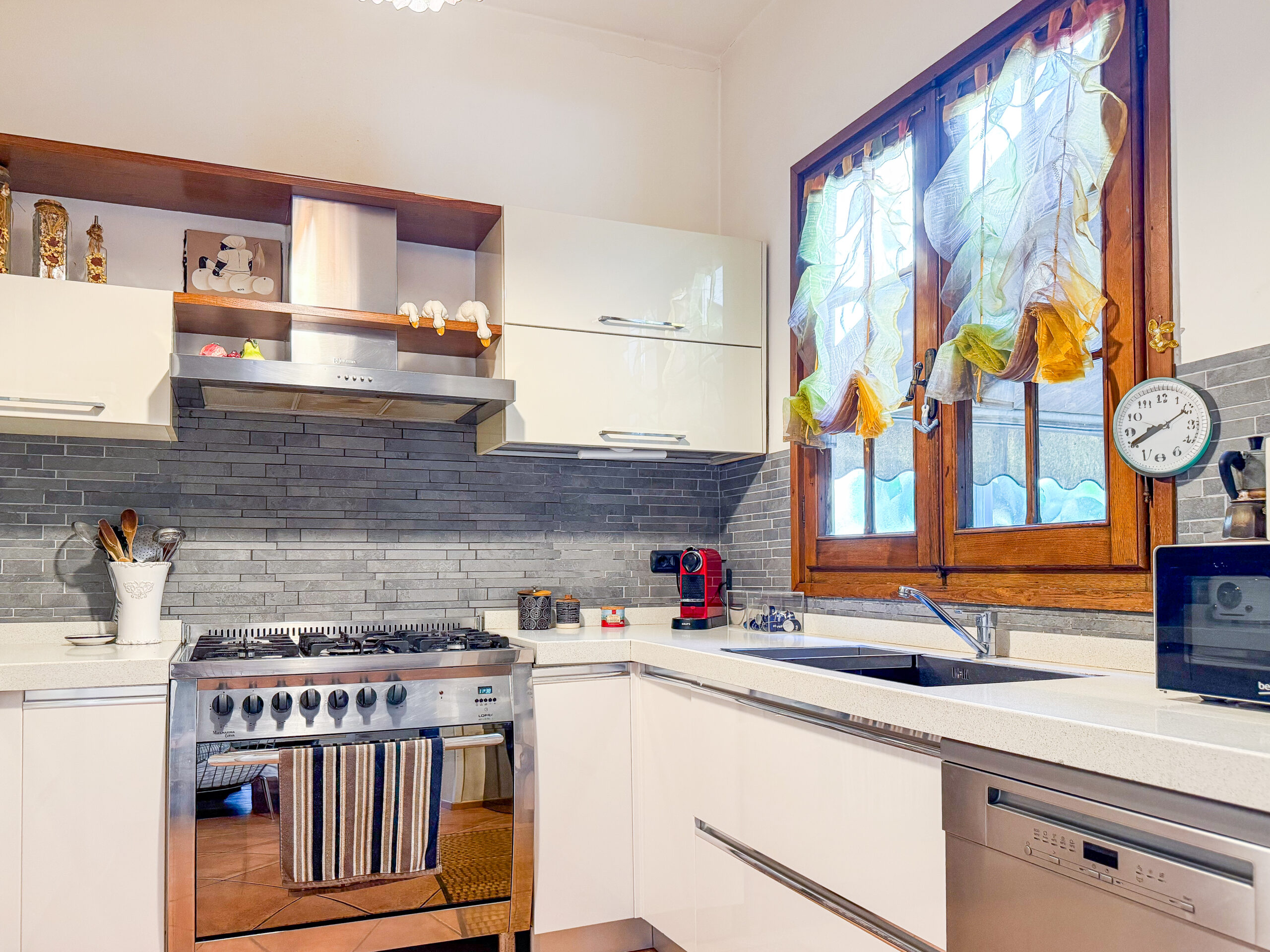 Al piano terra, la zona giorno si apre con naturalezza: salone immenso, cucina aperta sul tinello, giardino davanti, resede sul retro.